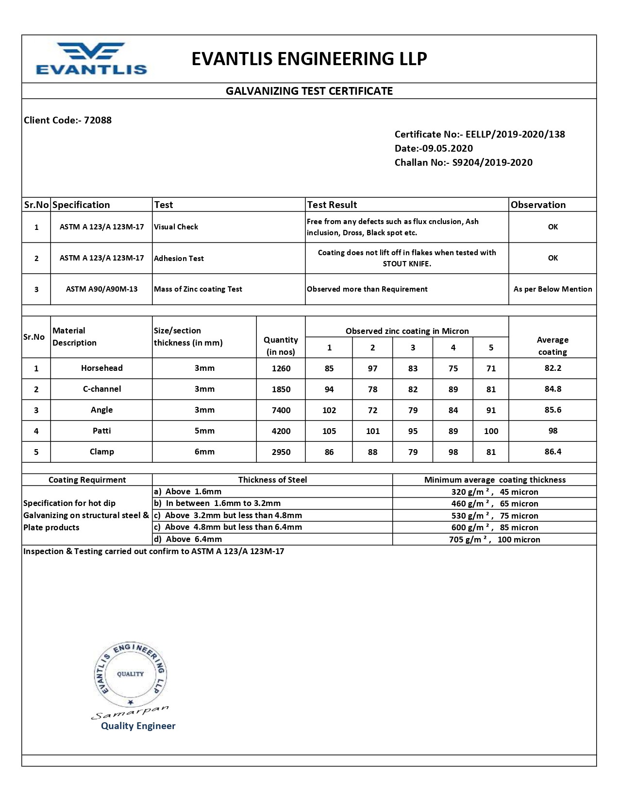 Hot Dip GalvanizingAmerican Standard (ASTM A123/A123M), A153/A153M (for hardware)